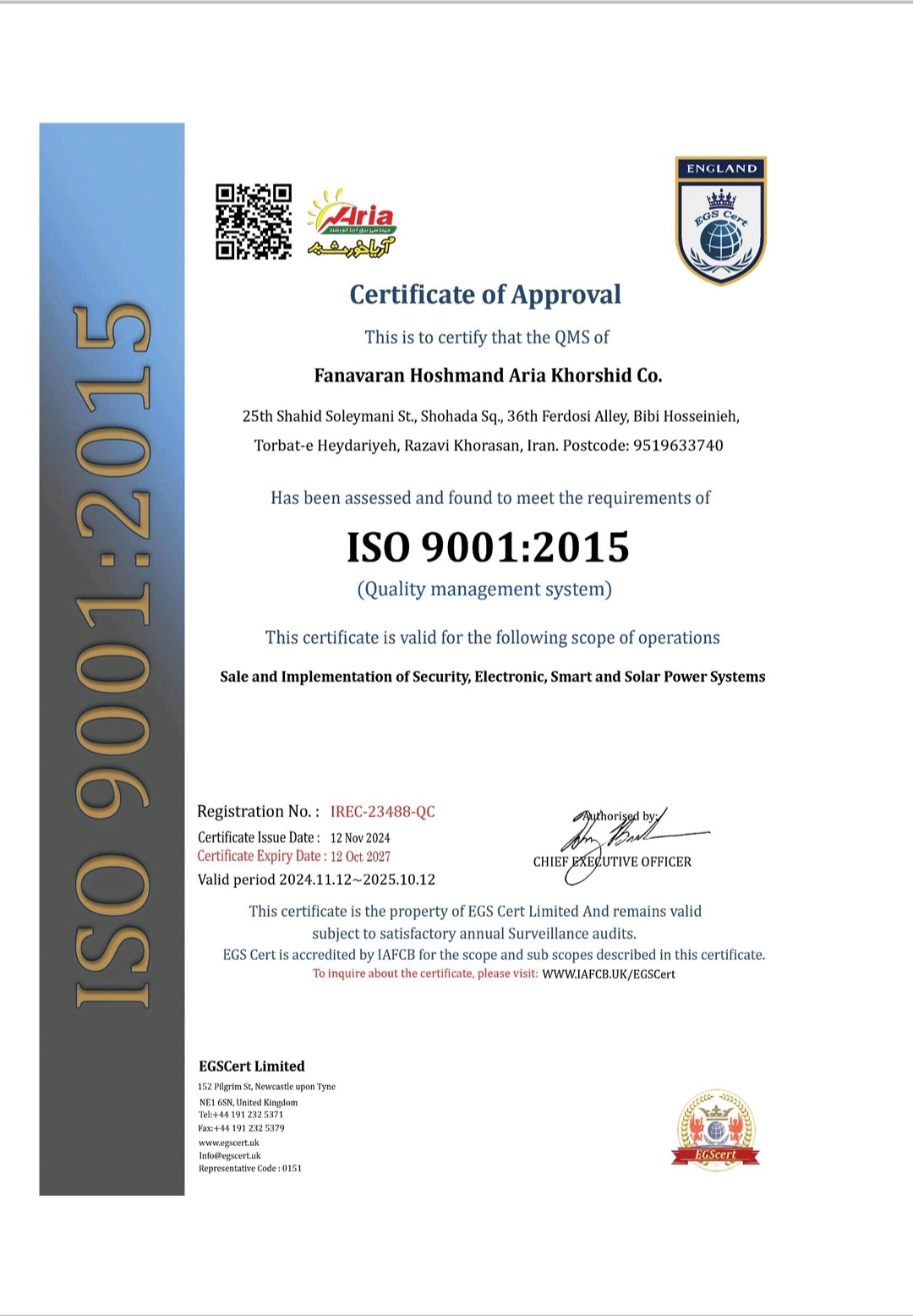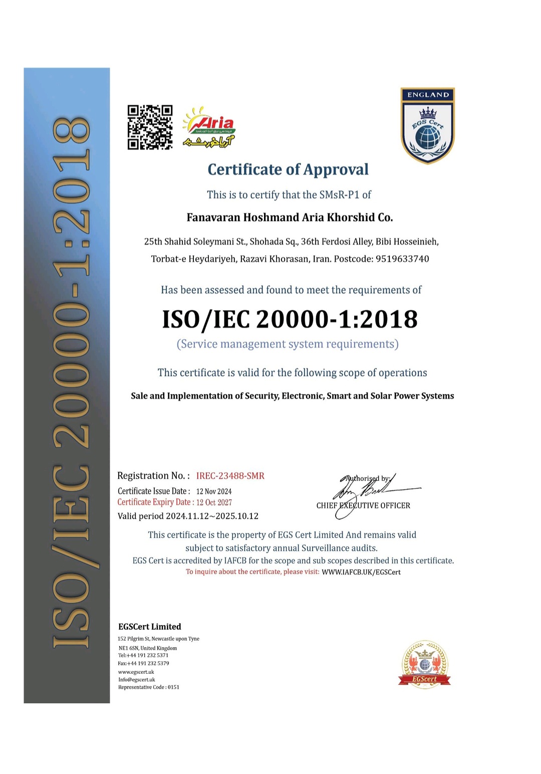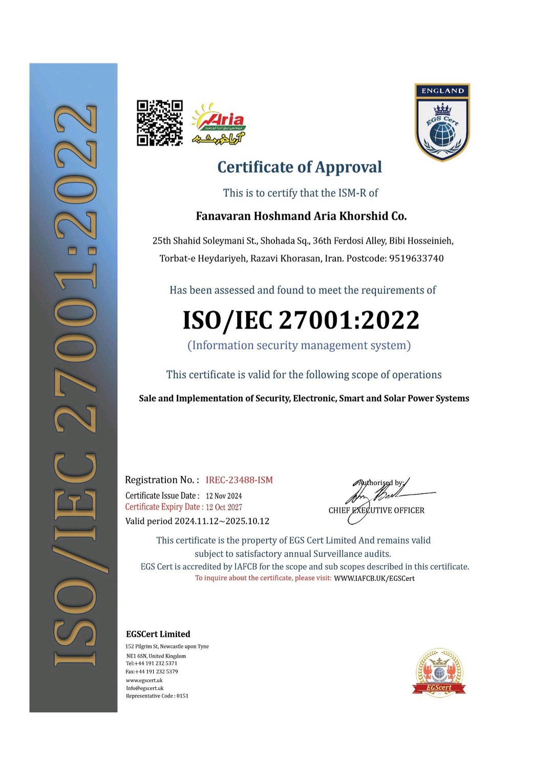 شرکت مهندسی برق و الکترونیک فناوران هوشمند آریا خورشید، با مدیریت مهندس جواد روانبخش در تاریخ 1390/09/04 فعالیت خود را در شهرستان تربتحیدریه آغاز نموده است و با بهره گیری از تجربیات ارزشمند در یک دهه ی گذشته و به کارگیری پرسنل خلاق و با تجربه، هر سال بیشتر از گذشته جایگاه خود را در حوزه ی سیستم های امنیتی، الکترونیکی و انرژی های تجدید پذیر ارتقا داده است. در همین راستا با هدف ارائه خدمات بیشتر و متناسب به نیاز کاربران، از سال 1398 اقدام به معرفی و تولید محصولات با کیفیت از قبیل انواع دوربین مداربسته، دزدگیر اماکن، چراغ های خورشیدی و ... با برند آی سان (EYESUN) شده است. همچنین این شرکت در چند سال اخیر در زمینه طراحی،اجرا و راه اندازی سیستمهای برق خورشیدی و نیروگاه خورشیدی به صورت تخصصی فعالیت خود را ادامه داده و در پروژه های متعددی در زمینه سیستم های خورشیدی آفگرید، نیروگاه برق خورشیدی،تلویزیون شهری و ویدئو وال در سطح کشور مشارکت داشته است.