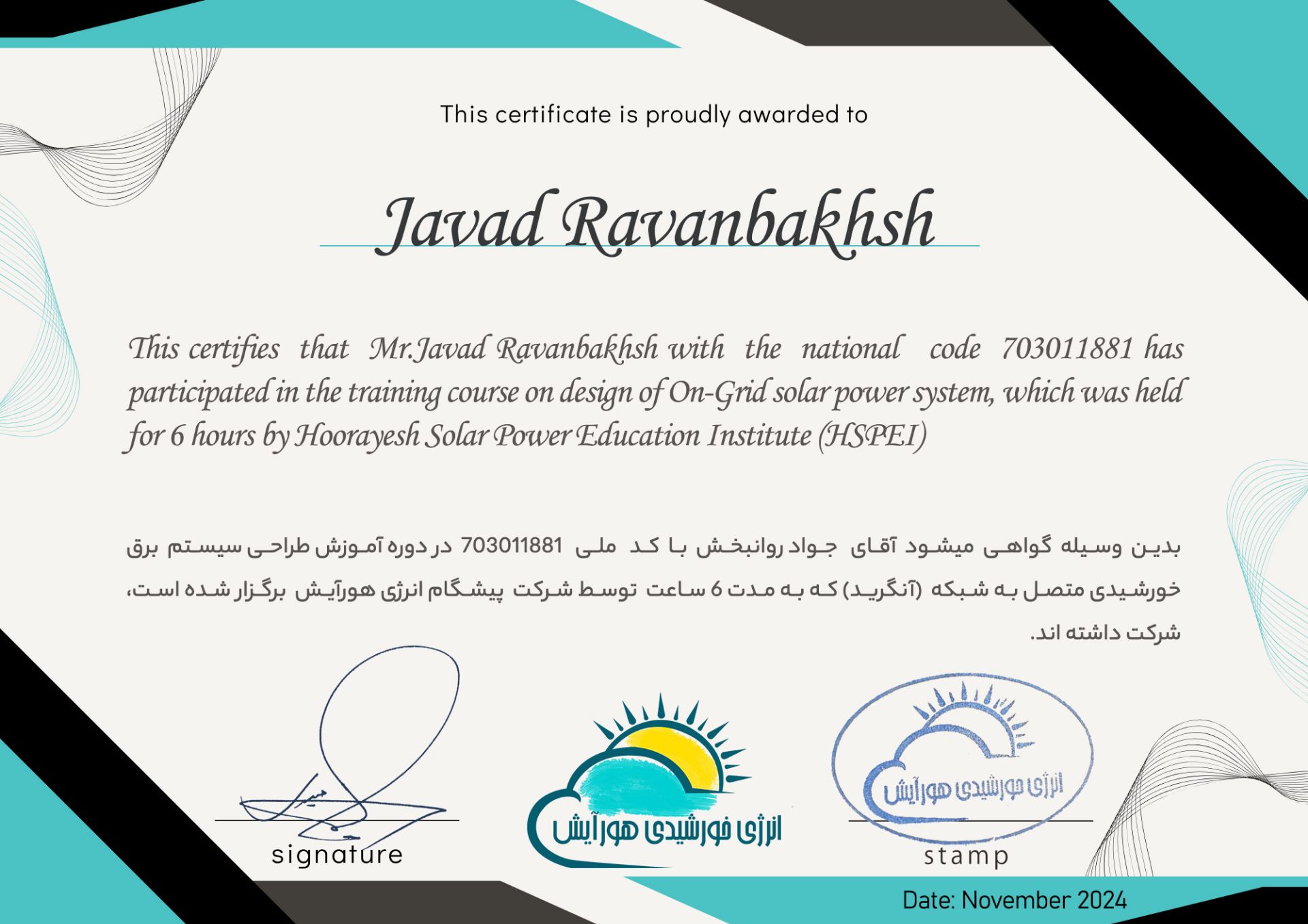 جواد روانبخش متولد 1363/11/14 با شماره تماس 09151312500 کارشناس ارشد مهندسی برق، مدیر عامل شرکت فناوران هوشمند آریا خورشید، با چهارده سال سابقه کار در زمینه مهندسی برق و الکترونیک، چند سال تدریس در دانشگاه و مراکز فنیحرفهای، دارنده گواهینامه معتبر از آموزش فنیحرفهای، تندیس مدیر موفق در همایش بینالمللی EFMD هستند.